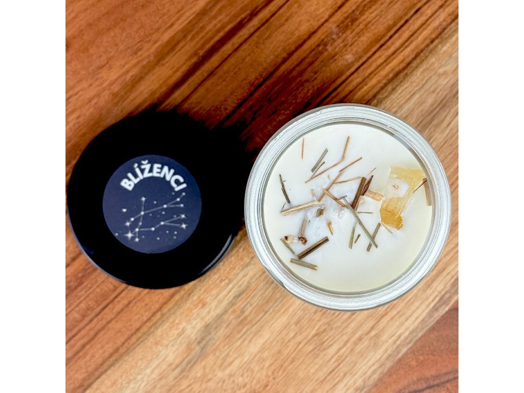 Ručne liata sójová sviečka vytvorená pre energické a zvedavé znamenie Blížencov. Spája jasnú, slnečnú energiu citrínu s osviežujúcou vôňou citrónovej trávy, ktorá prebúdza kreativitu, uvoľňuje myseľ a podporuje komunikáciu – prirodzený dar Blížencov.