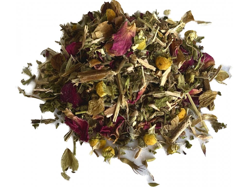 ZLOŽENIE: Rumanček kamilkový, Medovka lekárska, Levanduľa lekárska, Hluchavka, Vŕba - kôra, Ruža - lupene