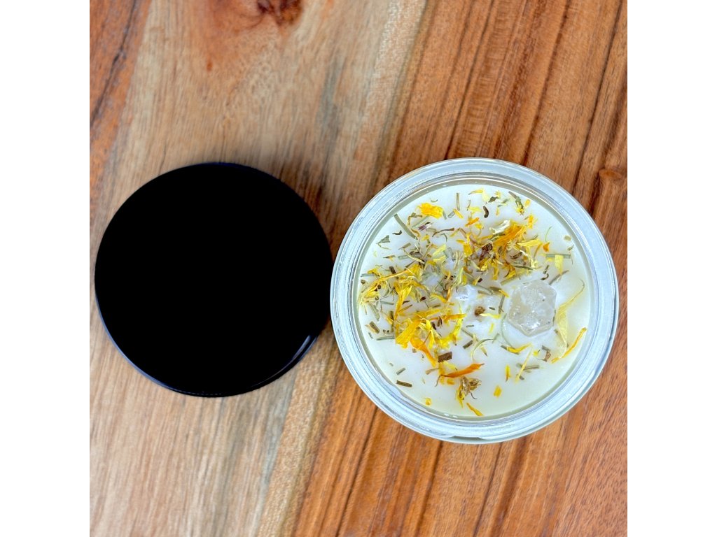 ZLOŽENIE: Sójová sviečka s esenciálnym olejom s arómou frézie nádherne prevonia váš domov aj vďaka pridanému rozmarínu a nechtíku.
