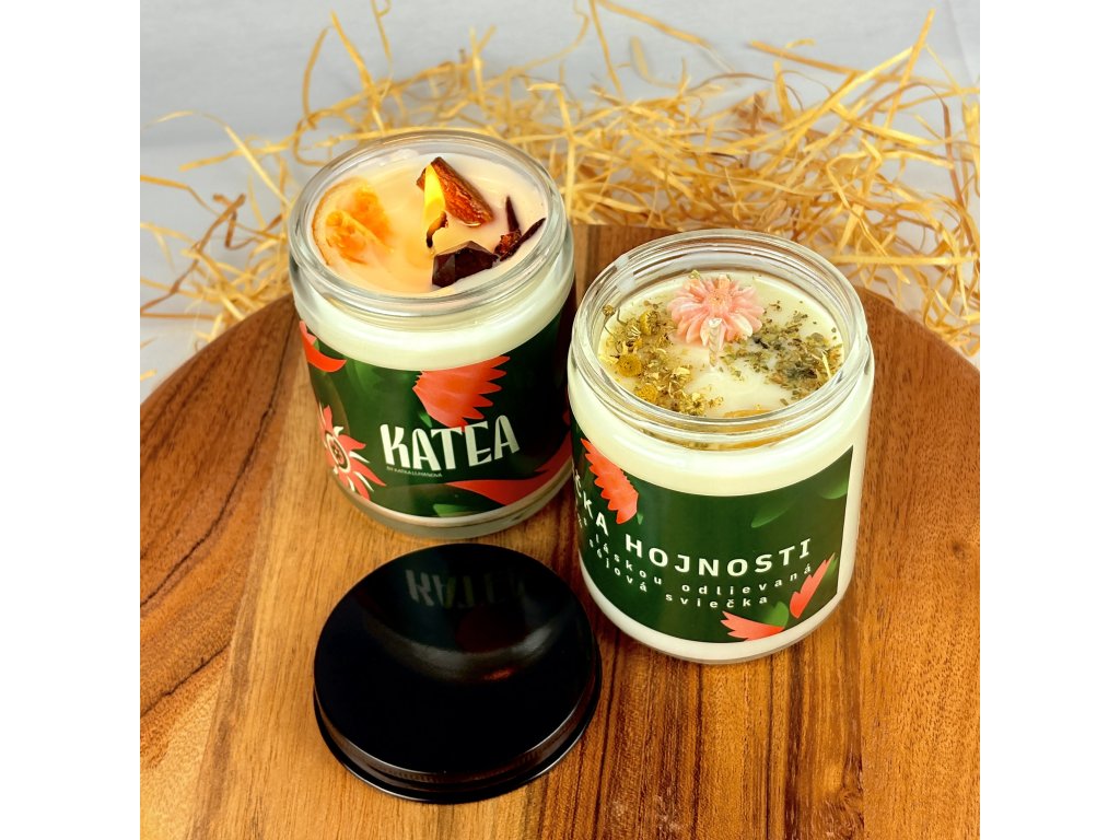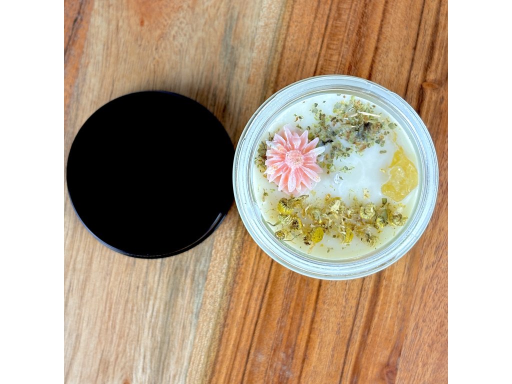 ZLOŽENIE: Sójová sviečka s esenciálnym olejom s arómou jazmínu nádherne prevonia váš domov aj vďaka pridanému harmančeku a majoránu.