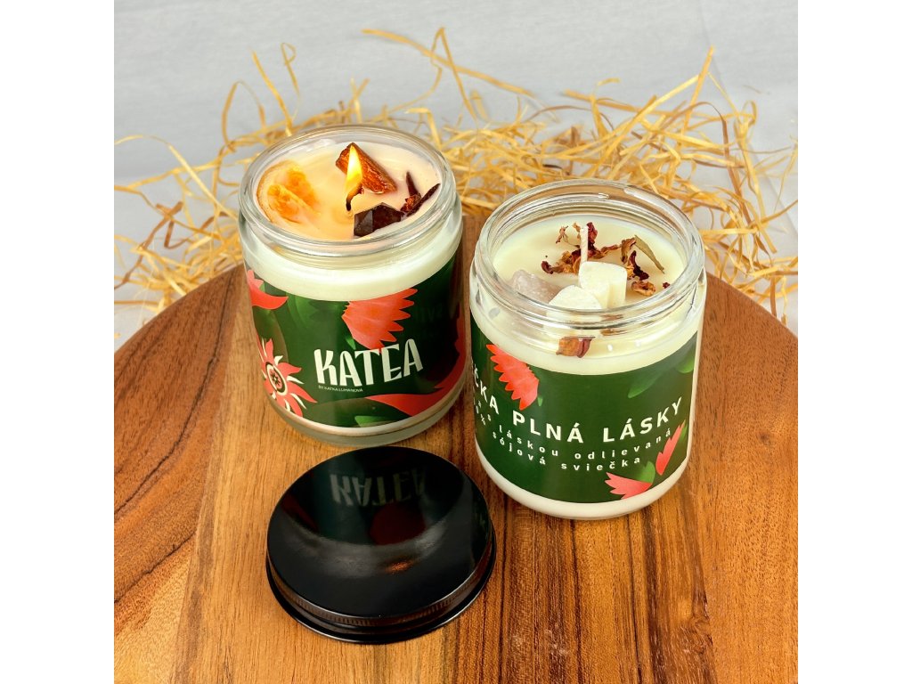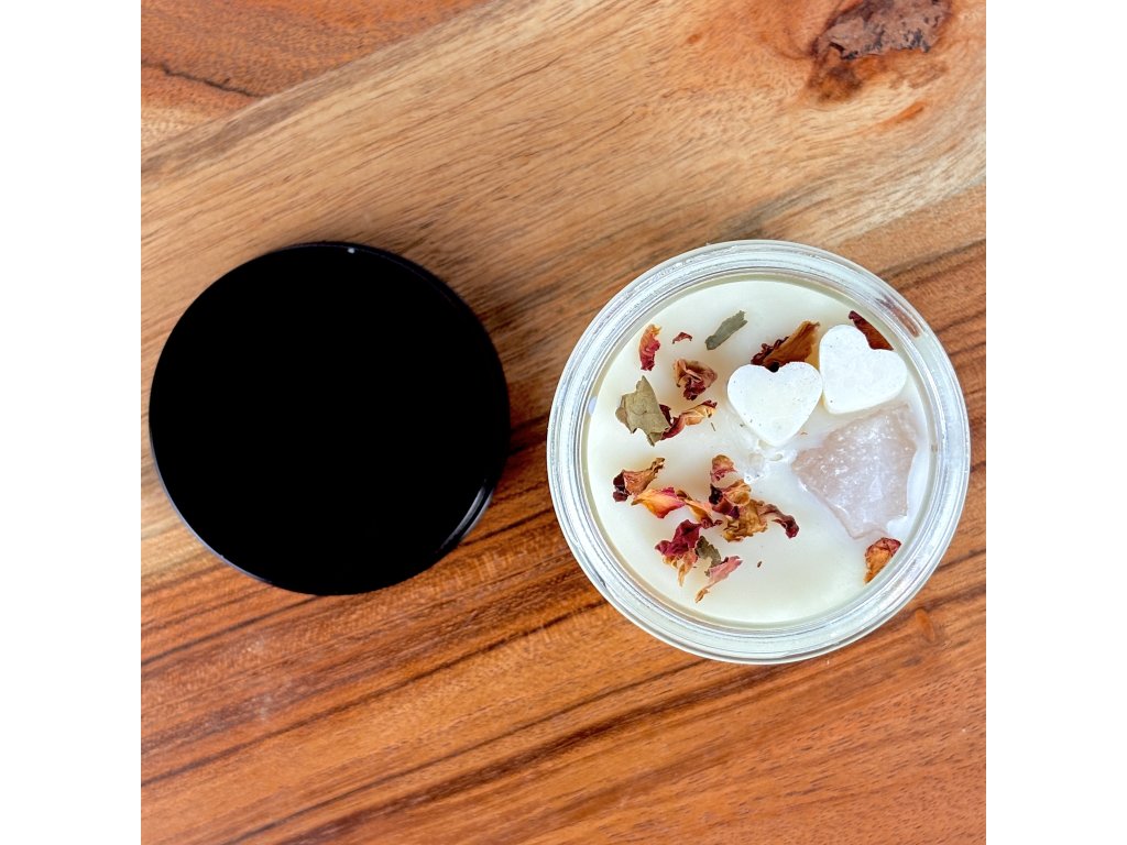 ZLOŽENIE: Sójová sviečka s esenciálnym olejom s arómou granátového jablka nádherne prevonia váš domov aj vďaka pridaným lupienkom ruží.